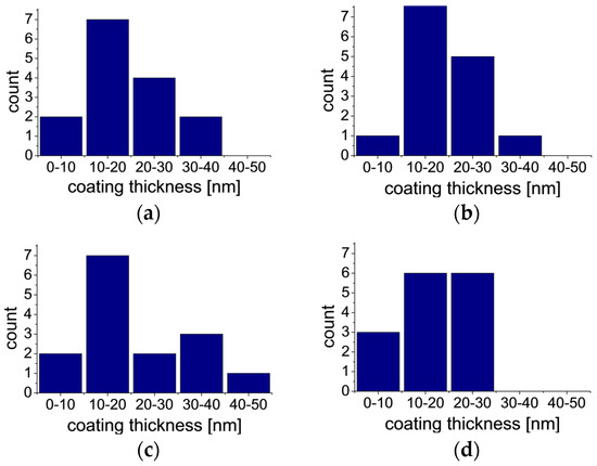 Histograms of measured thickness of coating 1(a); coating 2 (b); coating 3 (c); and coating 4 (d).