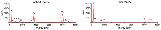 The elemental composition of layers was determined by the EDS analysis, which affirms that the resulting coatings are silica coatings. All EDS graphs of coated carbon were similar—the example is presented in Figure 7. Small peaks from Si atoms were observed on the graphs. The small amount of silica results from the small thickness of coatings. In the case of coated carbon fibers, aside from the silica, only carbon, oxygen, and elements coming from the background (copper and aluminum) are detected. In addition, the amount of C, relative to the uncoated fiber, increased indicating the presence of the organic moieties of the applied coating. In the case of uncoated carbon fibers, elements which indicate some remaining contaminations or some residual sizing on carbon fibers are observed, however, they were finally removed after the coatings deposition process.
