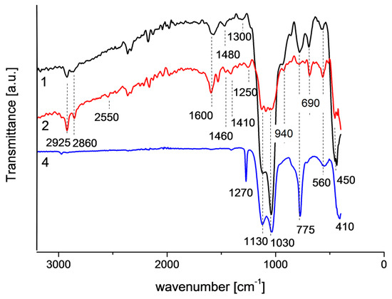FTIR spectra of powders corresponding to individual sols are presented in Figure 8. In each of the spectra a strong band in the range of 1000–1200 cm−1, characteristic for asymmetric stretching of Si-O-Si [20], with two maxima at 1030 and 1130 cm−1 is observed. The band at 1130 cm−1 is assigned to the Si-O stretching [21], the band at 1030 cm−1 to Si-O-Si skeletal vibrations which are characteristic for poorly cross-linked acid catalyzed gels [22]. The weak band at about 1250 cm−1 is assigned to antisymmetric Si-O-Si stretching longitudinal optical mode -LO3 [20,23]. The band characteristic for the rocking Si-O-Si vibration [20] is observed in spectra 1 and 2 at about 450 cm−1, in the case of spectrum 4 this band is probably overlapped by the band at 410 cm−1. Weak bands at 560 cm−1 are assigned to symmetric Si-O-Si stretching [24]. Moreover, in all spectra, the band identified as the bending Si-O-Si vibration, in which oxygen moves approximately at right angles to the Si–Si lines and in the Si-O-Si planes [20], is observed at 775 cm−1. The weak band characteristic for symmetric stretching of Si-OH [20] is observed at 940 cm−1 in spectra 1 and 2. The band at 690 cm−1 band is related to the Si-O or plane Si-O− vibrations [25].