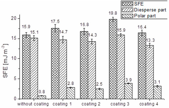 Substituting the literature value of SFE of cured epoxy resin (= 37.71 mJ·m−2, = 8.07 mJ·m−2) [3] in the above Equation (1) with the work of adhesion for the best obtained coating (coating 3) is determined as 62 mJ·m−2. It represents a growth of 16% in comparison to the work of adhesion for uncoated carbon fibers equal to 53 mJ·m−2.