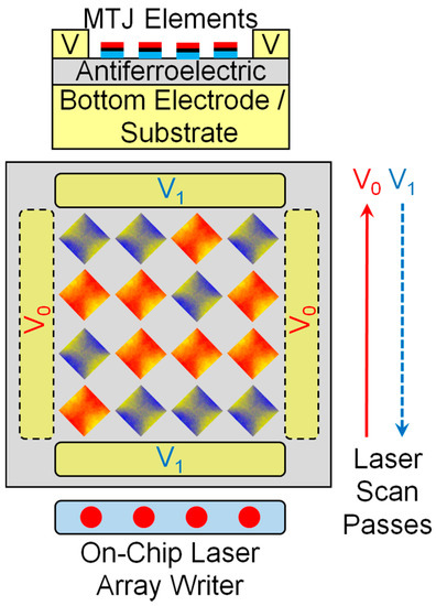 HAMM array. Information is stored in a patterned array of MTJ elements. Information is written using a low-power on-chip laser source and a minimal number of electrical contacts to the antiferroelectric layer, by heat-assisted stress-induced magnetisation switching. Two laser scan passes are used to write a block of information, in the first pass a voltage on the V0 contacts generates stress to write bits “0”, whilst, in the second pass, bits “1” are written using the V1 contacts. Heat pulses are delivered to the elements by the laser source as required during the scan passes.