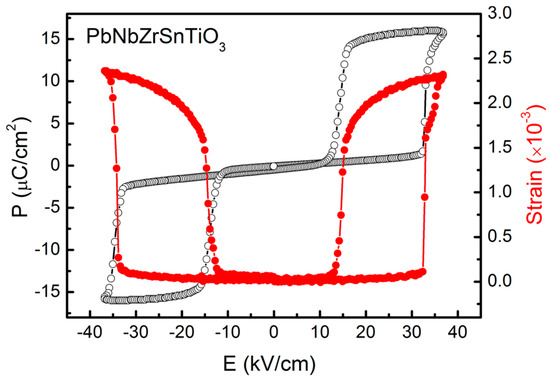 Antiferroelectric materialcharacterization. Polarisation (open discs) and out-of-plane strain (closed discs) loops as a function of applied electric field are shown for an antiferroelectric PbNbZrSnTiO3 material of 500 μm thickness. Antiferroelectric to ferroelectric phase transition occurs above 30 kV/cm.