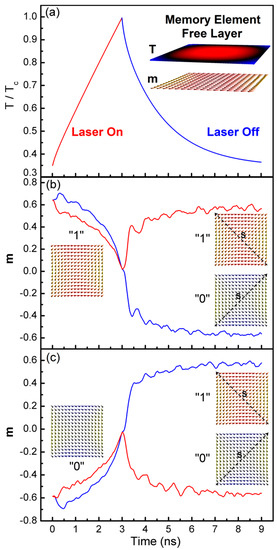 The magnetisation switching process is shown in Figure 3b,c starting from the “1” and “0” states, respectively. Depending on the applied stress direction, the end state is either “0” or “1”, respectively, as indicated in the figure. The applied stress induces an easy axis along the opposite diagonal; however, at lower temperatures, this is not strong enough to result in magnetisation switching. As the Curie temperature is approached, the average magnetisation length approaches zero. This reduces the effective energy barrier that must be overcome in order for the magnetisation to switch under the effect of the induced anisotropy due to the magnetoelastic coupling. To capture this process, it is important to include the effect of lattice vibrations on the magnetisation due to the non-zero temperature. This is achieved using the stochastic LLB equation (sLLB), where a thermal field, Hth, is added to the transverse damping torque effective field in the explicit form of the sLLB equation, and a thermal torque, ηth, is added to the sLLB equation [35]. The thermal field and torque are given in Equation (5), where their spatial and cross-correlations are zero, V is the volume of the computational cellsize, which was set to 5 nm3, ∆t is the fixed time-step used in the sLLB evaluation (the Milstein scheme was used here with ∆t = 0.1 ps [36]), and rH, rη are random unit vectors: