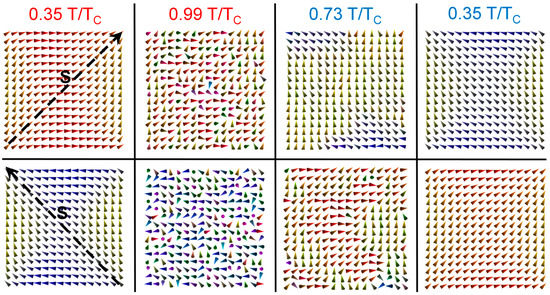 For magnetic nanoparticles, the switching probability can be described using an Arrhenius law based on the Néel–Brown thermal activation model [37,38]. Here, the switching process tends to be dominated by reverse domain nucleation at the corners. This is illustrated in Figure 4, where snapshots of the magnetisation configuration during switching events are shown at different temperatures in the heating-cooling cycle. Close to TC, due to the strong effect of lattice vibrations on the magnetisation, the configuration is almost random, although a preferential alignment along the starting magnetisation configuration is still maintained. As the sample cools, reverse domains are nucleated along the induced anisotropy axis. The reversed domains quickly grow in size, finally reaching the reversed magnetisation configuration along the opposite diagonal.