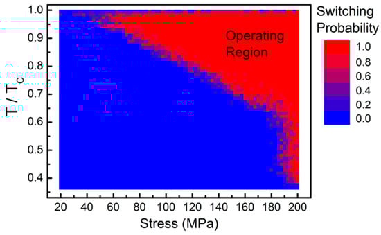 Switching probability as a function of temperature and stress magnitude. The probability of switching from state “1” to state “0” was computed as a function of maximum heat pulse temperature (varied by changing the laser pulse duration) from room temperature up to TC, and as a function of stress magnitude. The operating region where switching always occurs is marked.