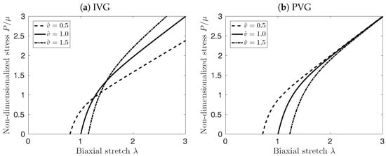 Figure 3 illustrates the implication of the different cases for growth kinematics on the mechanical properties of the vessel patch under equi-biaxial extension. PVG affects the edge length of the patch in stress-free configuration, which in turn affects mostly the material response at biaxial stretches smaller than . At large stretches , the material response is not influenced by the volume change, see Figure 3b. Conversely, TVG does not affect the edge length of the patch, and only the slope of the curves in Figure 3c is affected by the volume change. Finally, IVG exhibits mixed behavior, modifying both, the stress-free edge length of the patch as well as the slope of the curves for large , see Figure 3a.
