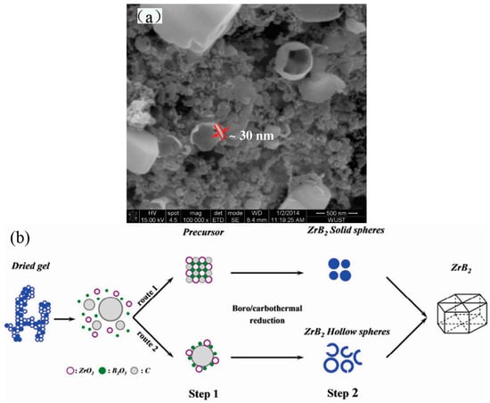 - Cao, Y.; Du, S.; Wang, J.; Zhang, H.; Li, F.; Lu, L.; Zhang, S.; Deng, X. Preparation of zirconium diboride ultrafine hollow spheres by a combined sol-gel and boro/carbothermal reduction technique. J. Sol-Gel Sci. Technol. 2014, 72, 130–136. [Google Scholar] [CrossRef]