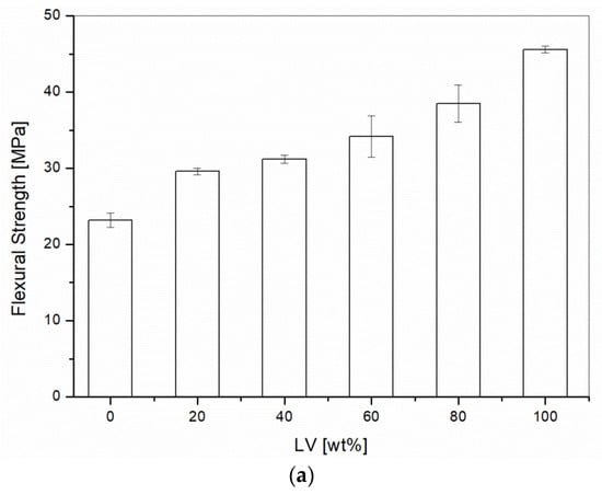 Flexural testing on PP/Liquid Wood as a function of the Liquid Wood (LV) content: (a) Flexural strength; (b) Flexural modulus.