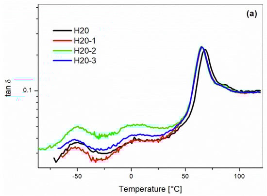 Composites were also tested by DMA. The results are summarized in Figure 10. The tan δ curves showed decreasing values for the height of the α-relaxation peak with an increasing amount of hemp reinforcement. The reduction of tan δ with the addition of fibers was the consequence of the rougher surface of the natural fibers, which decreased the friction and the sliding between the matrix and the reinforcing fibers [31]. Only a minor shift of the tan δ peak was measured, which meant that the hemp fibers did not significantly affect the α-relaxation phenomena. The decrease of the tan δ is relevant for the damping behavior of the composites.