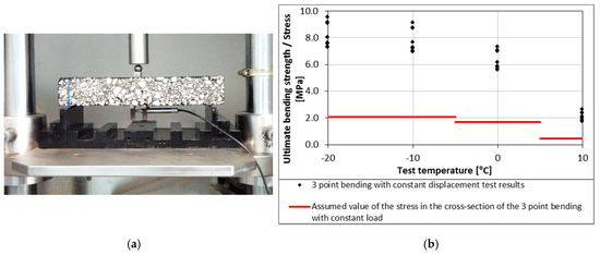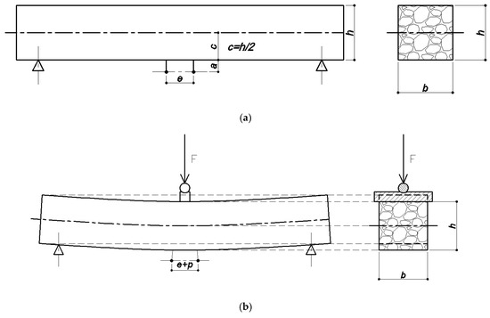where: σ—stress at the bottom of the specimen in its mid-length, MPa; M—bending moment in mid-length of the specimen, kNm; W—moment of inertia in the cross section, m3; F—force applied by the CRT-HYD25 universal test machine, kN; l, h, b—specimen dimensions, mm. All of the described distances and dimensions are presented in Figure 2.