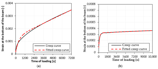 Bending creep test results—creep curves and fitting of the creep using Burgers model at test temperatures: (a) 0 °C; (b) −20 °C.