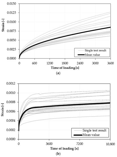 As shown in Figure 4, apart from single creep curves, the test results presented narrow scatter, which is typical of complex materials, such as asphalt mixtures. The coefficient of variation for 20 separate specimens in the case of measured strains is around 20% for both test temperatures. In the case of determined Burgers rheological model parameters, the coefficient of variation is higher and ranges from 10 to 25% for E1 modulus, from 18 to 40% for E2 modulus, from 30 to 60% for the η1 coefficient of viscosity and from 18 to 40% for the η2 coefficient of viscosity. Nevertheless, the coefficients of variation range from 5 to 25% even in typical tests in which only 4 or 5 separate specimens are tested.