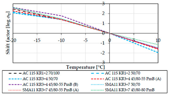 Shift factors for all tested mixtures (reference temperature Tref = 0 °C).