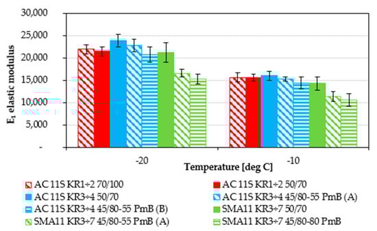 An increase in modulus E1 causes an increase in tensile stresses during cooling of asphalt layer. In the case of E1 modulus, values obtained for typical asphalt concretes presented similar levels. There were slight differences in the case of asphalt concrete for heavier traffic (KR3-4) at the temperature of −20 °C. Both mixtures with modified bitumen presented lower E1 stiffness values than the reference mixture with 50/70 neat bitumen. A slight difference was visible between mixtures with polymer modification as well. The mixture with bitumen from refinery B presented better low-temperature performance (lower value of modulus E1). However, the differences in this case were not significant and lay within the range of scatter of the test results. A more evident situation is visible for stone mastic asphalt mixtures. Mixtures with polymer-modified bitumen presented significantly better low-temperature performance in comparison with the reference mixture with 50/70 neat bitumen. Interestingly and surprisingly, the differences between typical 45/80-55 and highly modified bitumen 45/80-80 were not significant.