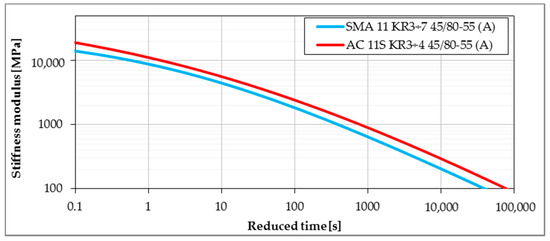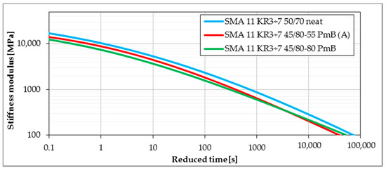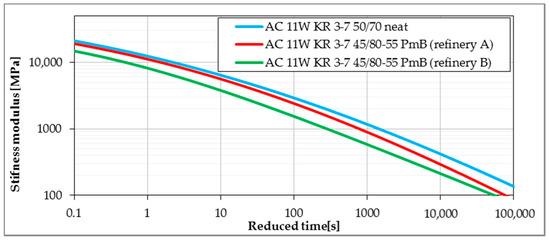 Also in the case of the type of bitumen, the obtained results present the low-temperature performance in accordance with the expectations. The higher the modification of bitumen, the lower the stiffness modulus at low temperatures. But, similar to the results of the Burgers model rheological parameters, the difference is more visible between neat and modified bitumen. In the case of typical and highly modified bitumen, while the highly modified bitumen presented lower values of stiffness modulus for smaller reduced times (corresponding to lower temperatures), the differences were slight. What is more interesting, for much longer reduced times, the mixture with highly modified bitumen presented higher values of stiffness modulus in comparison with typical modified bitumen, which was probably connected to the lower values of the creep slope obtained for highly modified bitumen at the temperatures of 0 °C and +10 °C.