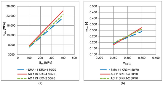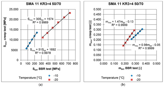 Example of the relationship between (a) bitumen stiffness from the BBR test Sbit and stiffness modulus of asphalt mixture from the creep test Smix; (b) m-value of asphalt binder from the BBR test mbit and m-value of asphalt mixture mmix.