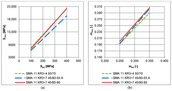 The effect of the application of different types of bitumen in SMA is presented in Figure 14. Regardless of the same mineral composition and bitumen content, the SMA 11 with neat bitumen 50/70 revealed highest values of Smix and the lowest values of mmix as a function of Sbit and mbit, respectively. This indicates the worst low-temperature performance of SMA 11 with neat bitumen 50/70. It should be stated that the usage of the bitumen test method alone is insufficient for assessment of asphalt mixture low-temperature properties, based only on the current standardization of the bitumen binders. This means that the same asphalt binder in different asphalt mixtures may exhibit different low-temperature properties.