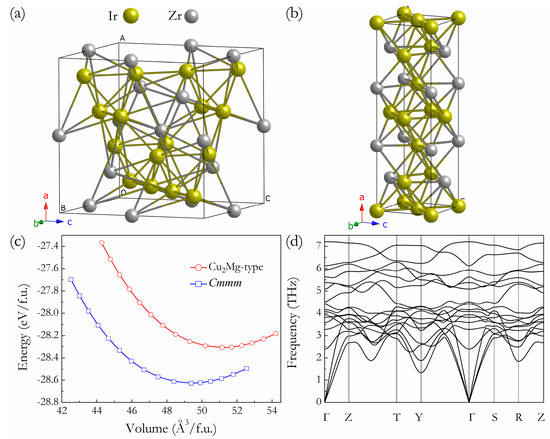 Crystal structures of Cu2Mg-Ir2Zr (a) and Cmmm-Ir2Zr (b), the large and small spheres represent Ir and Zr atoms, respectively. The total energy vs. f.u. volume for Cu2Mg-type and Cmmm structures (c) and phonon dispersion curves of Cmmm-Ir2Zr at 0 GPa (d).