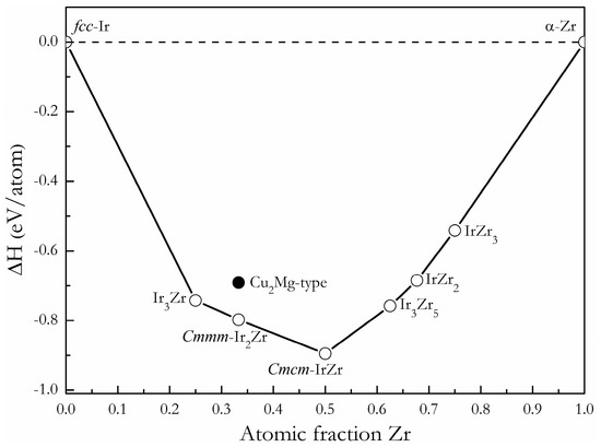 The formation enthalpy vs. composition plot, called a convex hull, is the set of lines connecting the lowest energy structures, and any structure whose formation enthalpy lies on the convex hull is deemed stable and synthesizable in principle [33]. In the Ir-Zr system, the formation enthalpy of each IrxZry intermetallic with respect to the fcc-Ir and α-Zr separate phases is quantified by the formula. Based on the calculated formation enthalpy for each IrxZry intermetallic compound, we reconstructed the convex hull line for the Ir-Zr system, as shown in Figure 2. One can see that the formation enthalpy of Ir-Zr intermetallic decreases when x < 0.5, while the formation enthalpy increases when x > 0.5. The Cmcm-IrZr is the most stable intermetallic compound among all the studied intermetallic compounds, which is in excellent agreement with the previous works [18]. The predicted Cmmm structure for Ir2Zr matches evidently with the convex hull curve between the experimental L12-Ir3Zr and Cmcm-IrZr phases, indicating the possible synthesis of this composition in the real experiment. However, the previously proposed Cu2Mg-type phase for Ir2Zr is located above the convex hull line and possesses a higher formation enthalpy, at 107 meV/atom, than that of the Cmmm phase, suggesting that the Cu2Mg-type phase for Ir2Zr is indeed metastable. In addition, we suppose that the synthetic conditions of Cmmm-Ir2Zr may be similar to those observed for the formation of Ir3Zr5 for their similar values for formation enthalpies presented in the convex hull line.