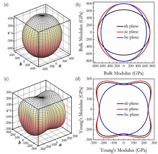 Three-dimensional surface representations of bulk modulus B (a) and the Young’s modulus E (b) at 0 GPa, and the projections of bulk modulus B (c) and the Young’s modulus E (d) within ab, ac, and bc planes.