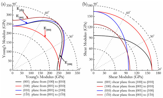 where α1, β1, γ1, α2, β2, γ2 are the direction cosines of the [uvw] and [HKL] directions in the coordinate systems, where the [HKL] denotes the vector normal to the (hkl) shear plane. The three-dimensional (3D) surface representations showing the variation of the bulk modulus B and Young’s modulus E are plotted in Figure 3a,c, and the distance from the origin of the system of coordinates to this surface is equal to the B or E in a given direction. The plane projections (ab, ac, and bc planes) of the directional dependences of the bulk modulus B and Young’s modulus E are given in Figure 3b,d for comparison. It can be seen that Cmmm-Ir2Zr exhibits a highly pronounced elastic anisotropy, as its 3D picture shows a large deviation from the spherical shape, which qualifies an isotropic medium. From Figure 3b,d, the distributions of bulk modulus B and Young’s modulus E within the crystal plane bc display the largest and the smallest elastic anisotropy behaviors, respectively. In more detail, the changes of Young’s moduli along different crystal directions within four specific planes (001), (100), (010), and are presented in Figure 4a. For example, the variation of Young’s modulus E in the (100) plane for the quadrant of directions [uvw] between [001] (θ = 0°) and [010] (θ = 90°), the Cmmm phase displays the smallest elastic anisotropy behavior (as shown in Figure 3d) with a maximum of 254 GPa and a minimum of 240 GPa. The selected directional Young’s moduli along the five principal crystallographic directions are denoted as in Figure 4a, and it can be seen that the calculated values for E decrease in the following order: E[100] ≈ E[010] < E[011] < E[001] < E[110] < E[110] < E[101] < < . Similarly, Figure 4b presents the orientation dependence of the shear modulus along arbitrary shear directions within these four shear planes. Compared to the other three shear planes, the calculations show that the shear modulus for a shear deformation within the (100) plane is not only nearly isotropic [Gmax = G[010] = 164 GPa and Gmin = G[001] = 162 GPa] but also has greater resistance to shear deformations.