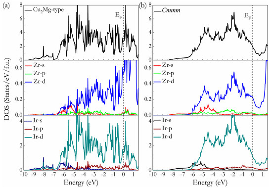 Calculated total and partial DOS of Cu2Mg-Ir2Zr (a) and Cmmm-Ir2Zr (b). The vertical dash line is the EF.