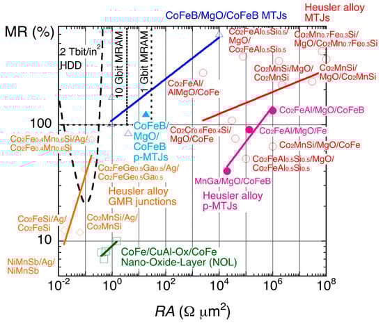 For further improvement in HDD and MRAM, it is critical to satisfy two criteria: (i) low resistance-area product (RA) and (ii) perpendicular magnetic anisotropy. The low RA is important to reduce power consumption and resulting unfavourable side effects, such as Joule heating and possible damage on spintronic devices. The perpendicular anisotropy is essential to achieve faster magnetisation switching [17,18] and to minimise stray fields from a MR junction and the associated cross-talk between the junction cells for MRAM. The recent development in MR ratios and RA is summarised in Figure 1. Figure 1 also includes the target requirements to achieve 1 Gbit MRAM, 10 Gbit MRAM and 2 Tbit/in2 HDD [19].