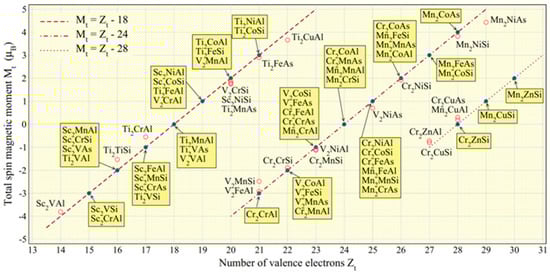 The other advantage of the Heusler alloys is their controllability of their magnetic properties, such as their saturation magnetisation and Curie temperature. The total spin moments per Heusler alloy formula unit (f.u.) (Mt) have been reported to follow the generalised Slater-Pauling curve as Mt = Zt − 24 (full-Heusler) and Mt = Zt − 18 (half-Heusler), where Zt is the total number of valence-band electrons (see Figure 3) [45]. The atomic substitutions of any constituent atoms in the Heusler alloys can continuously change their magnetic moments and allows for customising the alloys for a specific application. There are over 2500 combinations to form Heusler alloys [36], among which a few tens of alloys have been reported to become half-metallic ferromagnets according to theoretical calculations. The atomic substitution further increase the applicability of the alloys for custom design.