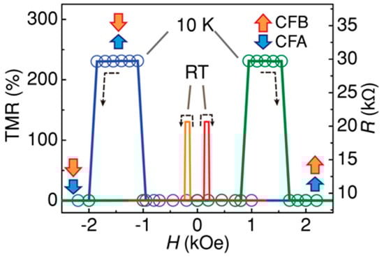 - Wang, W.; Sukegawa, H.; Shan, R.; Mitani, S.; Inomata, K. Giant tunneling magnetoresistance up to 330% at room temperature in sputter deposited Co2FeAl/MgO/CoFe magnetic tunnel junctions. Appl. Phys. Lett. 2009, 95, 182502. [Google Scholar] [CrossRef]
