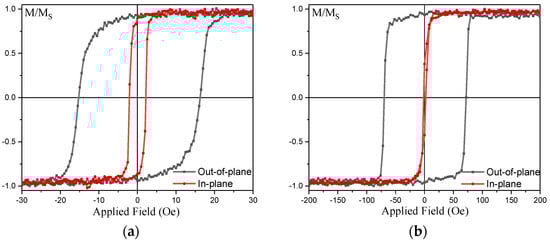 (a) Magnetisation curves of a Co2FeSi film grown on a V seed layer, consisting of Si sub./V (25)/Co2FeSi (4)/V (1.5)/Ru (3) (thickness in nm) measured under the magnetic field application in-plane (red) and perpendicular to the plane (blue); (b) Magnetisation curves of a Co2FeSi film grown on a W seed layer, consisting of Si sub./W (25)/Co2FeSi (4)/W (1.5)/Ru (3) (thickness in nm) measured under the magnetic field application in-plane (red) and perpendicular to the plane (black).