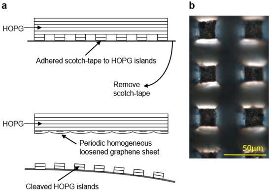 Shown in Figure 1a is the schematic for the proposed improved cleaving process, the pristine HOPG block is pre-patterned to create an array of 20 × 20 μm2 square islands with 30 μm wide and 50 μm deep etched spacing between them using a UV laser marking system, the HOPG block with the etched features is shown in Figure 1b. After patterning, the HOPG block is cleaved using household tape to completely remove the etched features from the HOPG and provides a flat surface with less defects for deposition, as shown further in the results and discussion section.