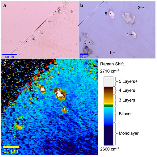 Then, graphene is directly transferred onto a silicon wafer with a 1 µm-thick thermal oxide layer by using an exfoliation voltage of 3 kV. The complete details of the sample preparation and electrostatic deposition setup are provided in the methods section. The deposition results are shown in Figure 2. The optical images in Figure 2a,b respectively show the edge of the deposited graphene (dashed line) at 10× and 50×, while the Raman micro-spectroscopy scan in Figure 2c maps the 2D Raman peak position(between 2660 cm−1 and 2710 cm−1) for the same region. The 2D peak center is taken as the center of a single-fitted Gaussian obtained from the Raman data between 2550–2750 cm−1. In the optical images, single-layer graphene cannot be resolved due to its low light absorption [10,13], while some double-layered graphene features appear in Figure 2b and multi-layered graphene regions are easily differentiated from the oxidized-silicon substrate. In contrast, the 2D-band center Raman mapping shown in Figure 2c, clearly shows the full coverage of the deposited graphene and confirms the dominant monolayer and bilayer structure [37,38,39]. A color scale bar showing the 2D-band center with the estimated number of graphene layers has been added for layer counting. As shown further down, the Raman spectra acquired at the positions specified for each layer number (shown in Figure 3) are in agreement with theoretical and experimental evidence found in the literature [37,38,39]. From these images, it becomes clear that most of the deposited graphene is single-or double-layered with only a few multi-layered graphene flakes near the edge.