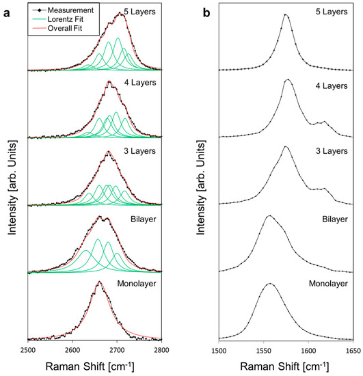 Meanwhile, Figure 3 shows the normalized Raman 2D-band peak evolution obtained experimentally from single-layer to five-layer graphene by averaging the specific areas identified in Figure 2b. These experimental results are consistent with theoretical predictions and experimental evidence [37,38,39]. Indeed, the splitting of the 2D peak as the number of graphene layer increases is shown by fitting the experimental curves with a set of Lorentzian curves. The full-width at half-maximum (FWHM) of the Lorentzian curves are measured between 24 cm−1 and 34 cm−1, with the exception of the single-layer Lorentzian curve measured at 55 cm−1 and the lowest Lorentzian used to fit the bi-layer curve at 50 cm−1. This deviation from the 24 cm−1 FWHM can be attributed to unintentional doping of charge carriers from the deposition method which is known to widen the 2D peak in single-layer graphene [40,41,42]. These values are summarized in Table 1. For comparison, Figure 3b shows the normalized Raman G-band for mono- to five-layer graphene obtained from the same areas. To obtain the values of the G peak center, a single Gaussian is used to fit the peak around 1500–1600 cm−1 to avoid any effect from the D’ shoulder (1620 cm−1). The variation of the G peak position is found to be fairly large, especially for mono- and two-layer graphene, this also suggests edge effects and excess charge carriers from the deposition method [41,42]. The large variation of G peak observed could also be explained by unintentional doping and/or stress effects which can be relevant in single layer graphene, but less so for multilayer graphene [43,44].