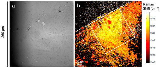 (a) White-light hyperspectral image with high field-of-view showing the edge of the deposition (dashed line). (b) Hyperspectral image of the full graphene deposition mapping the position of the highest intensity around the G peak (1500–1600 cm−1). The white box represents 130 μm × 130 μm. Acquired using RIMATM NANO (Photon Etc.).
