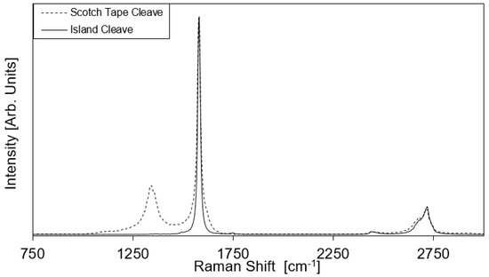 Our study has clearly shown that the cleaving process is critical to achieving such large-scale depositions. Micro-Raman analysis of the cleaved HOPG surface with and without laser pre-patterning offers a direct assessment of the improved cleaving method and highlights the importance of the cleaving process. Indeed, the Raman spectra averaged over a 100 µm × 100 µm area of the HOPG block after regular scotch tape cleave with and without laser pre-patterning are compared in Figure 5. Results show no measurable D-band on the cleaved surface of the pre-patterned HOPG block after the complete removal of etched islands, indicating a surface with less defects [22,41,42] compared to the conventional scotch tape cleaving method with no pre-patterning. Since the large scale deposition observed here never occurs without the full removal of the etched graphene islands via scotch tape cleaving prior to electrostatic deposition, we can reasonably speculate that this success is the result of an anchoring effect of the patterned island on the bulk HOPG when they are removed. This anchoring effect appears to loosen the underlying graphene sheets periodically at each removed patterned island to create a very homogeneously loosened graphene sheet which can then be removed from the bulk HOPG with minimal tearing or damage, thus allowing for larger-scale graphene depositions. Figure 1a illustrate this proposed mechanism. All these results clearly show that the cleaving method used in the preparation of the block before the electrostatic exfoliation of graphene has a critical impact on the resulting depositions and that improvements in terms of homogeneity of the cleaving methods can significantly improve the overall deposition results.