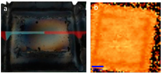 Since the micro-Raman stage’s travel is restricting the scan size, hyperspectral analysis with a much larger field-of-view (FOV) can be used over the same deposition to fully appreciate the deposition scale. Figure 4a shows the wide-FOV white-light image of the deposition, much like the optical images shown in Figure 2a,b. While it clearly shows the multi-layered graphene regions, the single- and double-layered graphene are again much harder to observe directly. However, Figure 4b shows a hyperspectral mapping of the highest intensity wavenumber around the G peak [22,38]. Like in Figure 3b, a larger variation in the G-band peak position is seen for single- and double-layered graphene producing high color contrast. The same straight edge previously observed in the Raman images from Figure 2 is also clearly seen here. The white frame in Figure 4b delimits the 130 μm × 130 μm deposition area and includes a 92% ± 2% coverage with single-and double-layered graphene, 4% ± 1% with multi-layered (three-layer or more) graphene and only 4% ± 1% uncovered. SEM images of the same deposition area confirm the results obtained with the micro-Raman and hyperspectral analysis and are shown in the methods section.