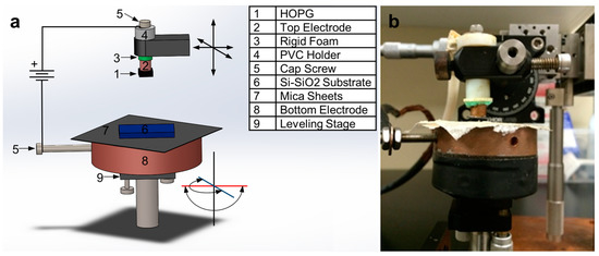 The electrostatic deposition of graphene starts from a bulk graphitic material. In this case, we use HOPG grade SPI-1 from SPI Supplies® with mosaic angles of 0.4° ± 0.1° and a typical lateral grain size of 3 mm. The substrate used for deposition is a silicon wafer with a 1 µm-thick thermal-oxide layer. In the experimental setup shown in Figure 7, the HOPG block is glued to a top electrode using silver epoxy. The top electrode consists of a 99% pure 1/2″ copper rod cut and polished to 3 cm in length. The top electrode is threaded to accommodate a 1/4″ × 1″ cap screw, which is used to connect the positive terminal of the high-voltage power supply. The top electrode is then placed inside a custom Polyvinyl Chloride PVC holder held by a XYZ micro-positioner stage. The stage can align and bring the HOPG in contact with the deposition substrate at the desired location on the substrate. A 2 mm-thick piece of rigid foam is attached to the bottom of the PVC holder to homogenize the horizontal forces applied on the HOPG block during the contact with the deposition substrate. The bottom electrode consists of a 4 in diameter 99% copper puck of 3 cm in height, also threaded to accommodate a 1/4″ × 1/2″ cap screw to connect the ground terminal of the high-voltage power supply. Three layers of 0.25mm-thick mica sheets are glued to the top of the bottom electrode with AA3106 (Loctite®, Dusseldorf, Germany) UV cured PVC bonding adhesive to create an insulating layer between the bottom electrode and the deposition substrate. The bottom electrode is attached to a gimbal levelling stage to ensure that the HOPG and the deposition substrate are parallel to each other so they come into complete contact. A Stanford Research Systems model PS375 +20 kV 10 W power supply is used as the high voltage power supply to connect the top and bottom electrodes with a high voltage cable. The set-up is placed in a Precise Basic Glove Box (Labconco®, Kansas City, MO, USA) with a controlled-atmosphere and purged with nitrogen to prevent arcing between the two electrodes.