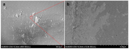 SEM micrographs were also taken using a SU 8230 FE-SEM (Hitachi, Rexdale, ON, Canada) with a cold field emission gun to characterize the deposition and confirm the Raman and Hyperspectral layer identification methods. Figure 8a,b shows the deposition in more detail than the optical images previously shown. Similarly to the optical images, the single layered graphene can barely be seen, although it can be distinguished from bi-layered graphene in Figure 3b. It can be seen here that the underlying graphene monolayer is not a single continuous sheet but shows some discontinuity. The same “ripped” features of the bi-layered graphene is even more apparent in these images. Moreover, we can also see some 3 layered graphene features that were not shown on the Raman image in Figure 1c, this is likely due to their small size, the resolution of the Raman image and the 2D peak center method of identification.