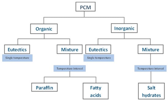 There are several ways to classify PCMs, according to their latent heat of fusion and melting point, according to temperature gradients [] and, most commonly, according to the method used to exchange heat and to change the state, which was used by Abhat [] in 1983. The most used PCM types are the one shown in Figure 1 within the temperatures range of this study (between 20 and 30 °C).