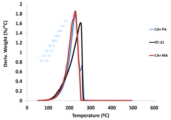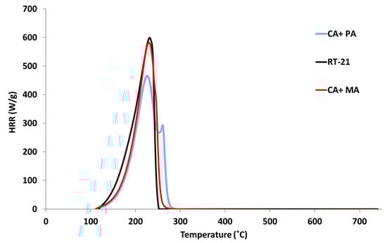 The curves of heat release rate (HRR) vs. temperature are shown in Figure 3. As can be observed, decomposition of the three PCM starts at around 100 °C. The peak of heat release rate (PHRR) corresponds to the maximum value of the HRR and the temperature of PHRR (TPHRR) is the temperature at which the PHRR takes place. High PHRR at low temperatures is usually related to a higher contribution in case of fire. In this case, all the samples have a similar TPHRR: 231 °C for the paraffin, 230 °C for the eutectic mixture of caprilic and palmitic fatty acids, and 226 °C for the eutectic mixture of caprilic and myristic acids. Regarding the PHRR, the paraffin PCM shows one unique peak of approx. 600 W/g. The CA + MA PCM shows one peak of 583 W/g and a shoulder can be identified around 245 °C. The PHRR of the CA + PA mixture is significantly lower, at 466 W/g, and a smaller second peak (292 W/g) takes place at 258 °C.
