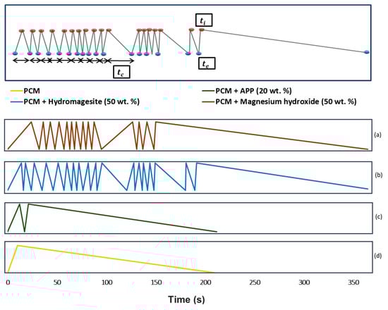 Figure 4 illustrates ignition/extinction periods obtained for the dripping test for capric acid and myristic acid eutectic mixture, for example. The peaks and valleys show the time when the PCM ignites (ti) (up) and extinguishes (te) (down). Furthermore, the period of time between each ignition and extinction is the combustion time (tc). Figure 4d shows the case of the plain PCMs. It can be seen that once ignited, the PCM keeps on burning until the fuel is exhausted. The addition of APP as flame retardant does not introduce significant changes in the fire performance (Figure 4c), from which we can conclude that this flame retardant is not acting on the load and under the conditions applied. The elevated number of peaks in Figure 4a,b indicates that a high number of ignitions and extinctions occur during the test. This fact is related to the ability to extinguish the flame of the PCM formulations with magnesium hydroxide and hydromagnesite. In the case of magnesium hydroxide, a delay on the time to ignition is also observed.