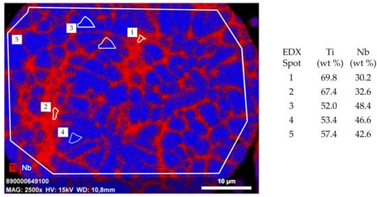 A representative SEM image of the polished cross section of a Ti-42Nb particle is displayed in Figure 2, indicating a dendrite-type segregation into Ti-rich and Nb-rich regions, displayed in red and blue, respectively. Pores or voids within the particle are not observed. The maximum chemical fluctuation within the as-atomized particle is in the range Ti-30Nb (spot 1) and Ti-48Nb (spot 3). The overall composition (spot 5) is Ti-42.6Nb, corresponding to the wet-chemical analysis performed using ICP-OES. According to X-ray diffraction studies, the material is entirely β-phase, whereas there is no indication for the presence of α-, α′-, or ω-phase, as reported for Ti/Nb alloys with higher Ti content [].