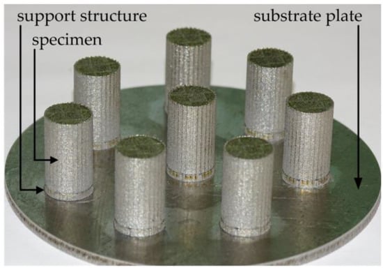 Figure 3 displays a set of compression test specimens printed on the above mentioned Nb substrate plate. For practical reasons, 1.5 mm thick support structures were printed initially. The printed cylinders (without support structures) had dimensions of d × l = 10.7 mm × 16 mm. After removal from the base plate, they were machined to d × l = 6.9 mm × 10.35 mm (d:l = 1.5) for further testing. Tensile test specimens with as-printed dimensions of d × l = 15 mm × 70 mm were obtained in accordance to the removal process of the compression test specimens. The final dimensions of the tensile test specimens in the “as-machined” condition are shown in chapter Materials and Methods.