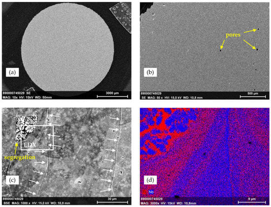 Figure 4 demonstrates SEM images of a polished surface of an as-printed tensile test specimen, a BSE image as well as an EDX mapping. The overview image (a) points to the fact that the as-printed specimen is homogeneously densified. Larger pores, voids, or segregation of large-scale inhomogeneities are not visible. On the basis of image (b), the relative density of the specimen can optically be estimated to be >99.5%. The BSE image (c) likewise displays a dense matrix that is rarely interspersed by tiny pores having diameter in the micron range. As a main feature, grain boundaries are visible (white arrows). The segregation in the upper left corner of the BSE image can undoubtedly be attributed to a Ti-42Nb particle or the residue of such a particle, which has not been melted by the laser beam during the SLM process. This is strongly supported by the EDX mapping (d), which displays the dendrite-type structure of the spherical SLM powder particles shown in Figure 2. However, such inhomogeneities are only extremely rarely observed throughout the specimens.