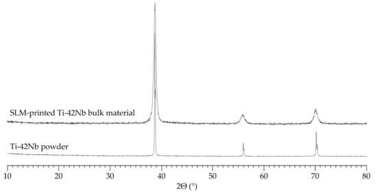 While Ti-rich Ti/Nb alloys may form complex microstructures composed of mixtures of α, α′, α′′, ω and/or β phase [,,,], X-ray diffraction (XRD) studies of SLM-printed Ti-42Nb (Figure 5) clearly indicate that the material entirely crystallizes in a bcc β-phase. This is in accordance with results obtained by XRD investigations using cast Ti-42Nb. Interestingly, a comparison of the XRD patterns of pre-alloyed precursor powder and SLM-printed Ti-42Nb display notably different line widths. The reflections of the printed material are markedly broadened compared to those of the powder, suggesting a significantly finer microstructure, which forms as a consequence of the extremely fast cooling during SLM processing.
