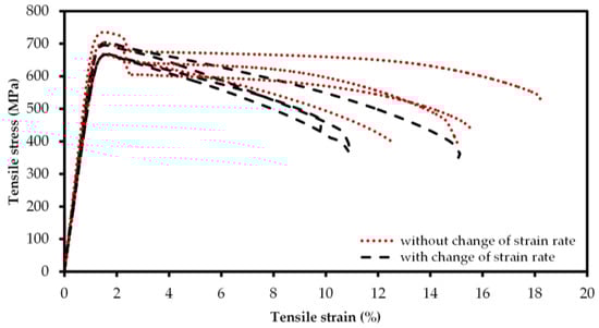 Stress-strain curves of the tensile test specimens tested with higher strain rate (black dashed) and with lower strain rate (red dotted) in the plastic region. All the determined stresses and strains are engineering stresses and strains. Specimens tested with higher strain rate in the plastic region showed higher decrease in stress with increasing tensile strain, whereas at the lower strain rate, the fractures occurred at higher tensile strains.