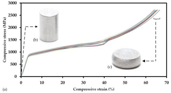 (a) Stress-strain curves of 17 analyzed compression test specimens. The more or less identical slopes of the stress-strain curves of all samples suggest a consistent SLM-process, independent of the position of the specimens on the building platform. The inserts correspond to compression test specimens before (b) and after (c) application of a compressive load of 101.9 kN.
