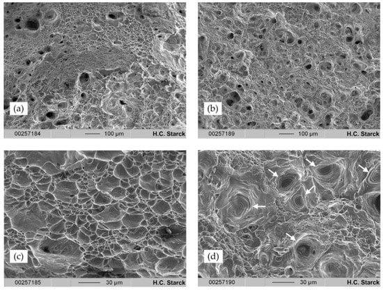 Scanning electron microscope images of the fracture spots after tensile testing of the Ti-42Nb tensile specimens at a 100× (a,b) and 500× (c,d) magnification for specimen 2 (a,c) and specimen 3 (b,d). The fracture surface of tensile specimen 2 (c) displays a comb structure typical for ductile material failure. Voids with circular lines marked by the white arrows in specimen 3 (d) indicate the presence of defective structures in the printed specimen.