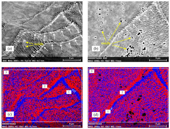 Scanning electron microscope images (a,b; BSE mode) and energy dispersive X-ray spectrometer (EDX) mapping (c,d) of polished cross-sections of Ti-42Nb compression specimens 10 (a,c) and 3 (b,d) after compression tests at 3000× magnification. The images (a,b) display structures that may be identified, for e.g., grain boundary formation and sliding bands, respectively, indicated by white arrows. The encountered structure sizes are in the range of few microns. For specimen 10 (a), only a few very small voids with diameter in the sub-micron range are observed, whereas a recurrent pattern of voids (up to 2 µm) is found for specimen 11 (b). The images (c,d) display a partially de-mixed microstructure with Ti- (red) and Nb-rich spots (blue). A spatial separation of Ti and Nb along the encountered structures is ascertained in both samples.