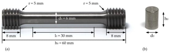 (a) Tensile test specimen after CNC machining the as-built specimens to the dimension claimed by the DIN 50106 standard; (b) compression test specimen after separation from the substrate plate and CNC-machining to the dimensions claimed by the DIN 50125 standard. The surface quality of the tensile and compression specimens is a result of the machining process and was not additionally polished.